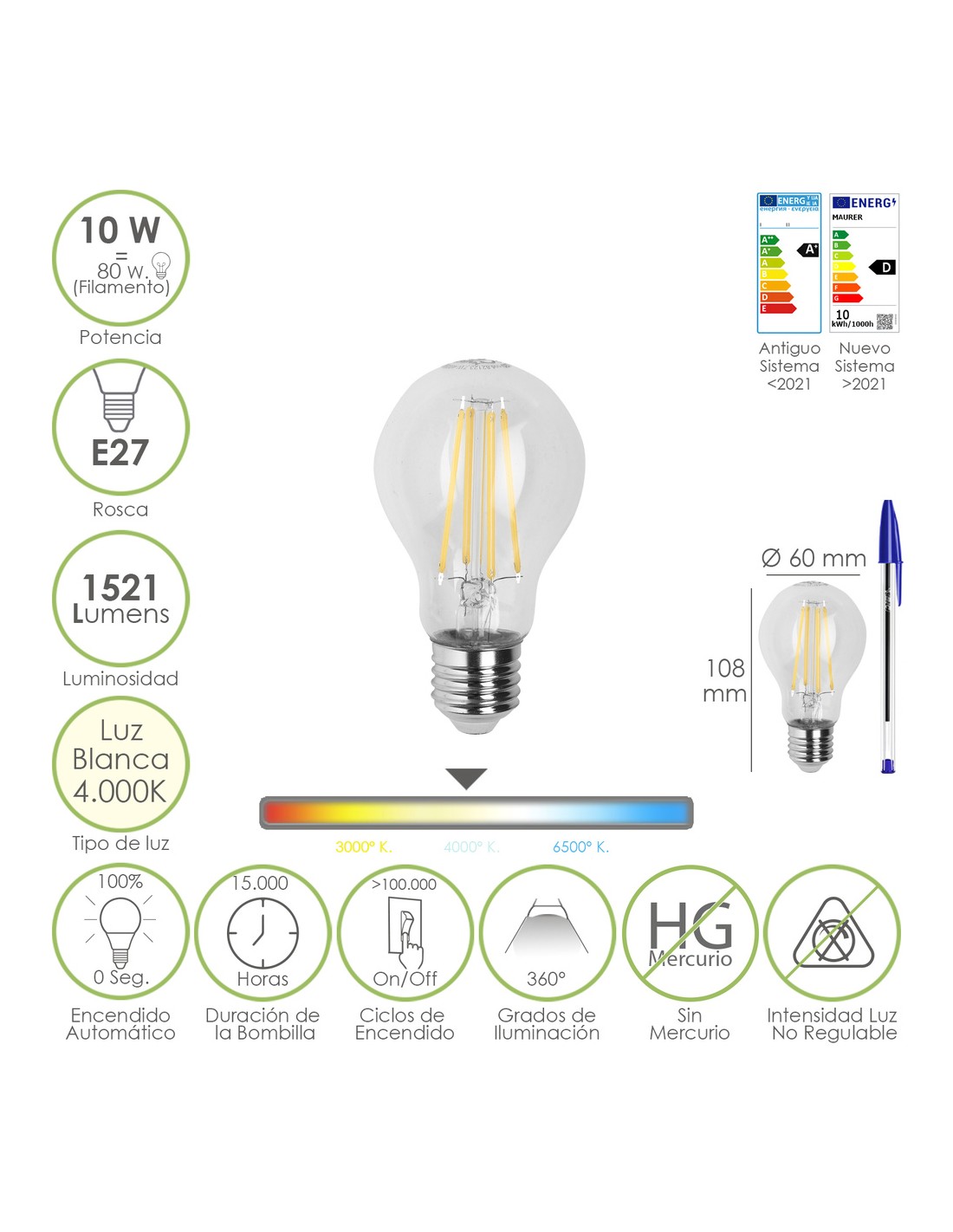- Vida de la bombilla 15.000 horas.