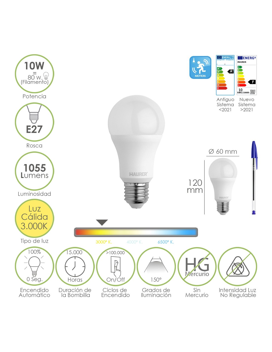 - Rosca: E27. Potencia: 10.5 W. equivalente a 80 W. aproximadamente de antigua incandescencia. Cuenta con sensor de movimiento, por lo que cuando detectete movimiento se encenderá.
