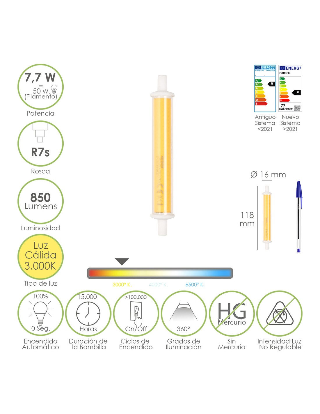 Bombilla Led Para Focos Rosca R7S. 7,7 Watt. Equivale a 50 Watt. 850 Lumenes. Luz Cálida (3000º K.)