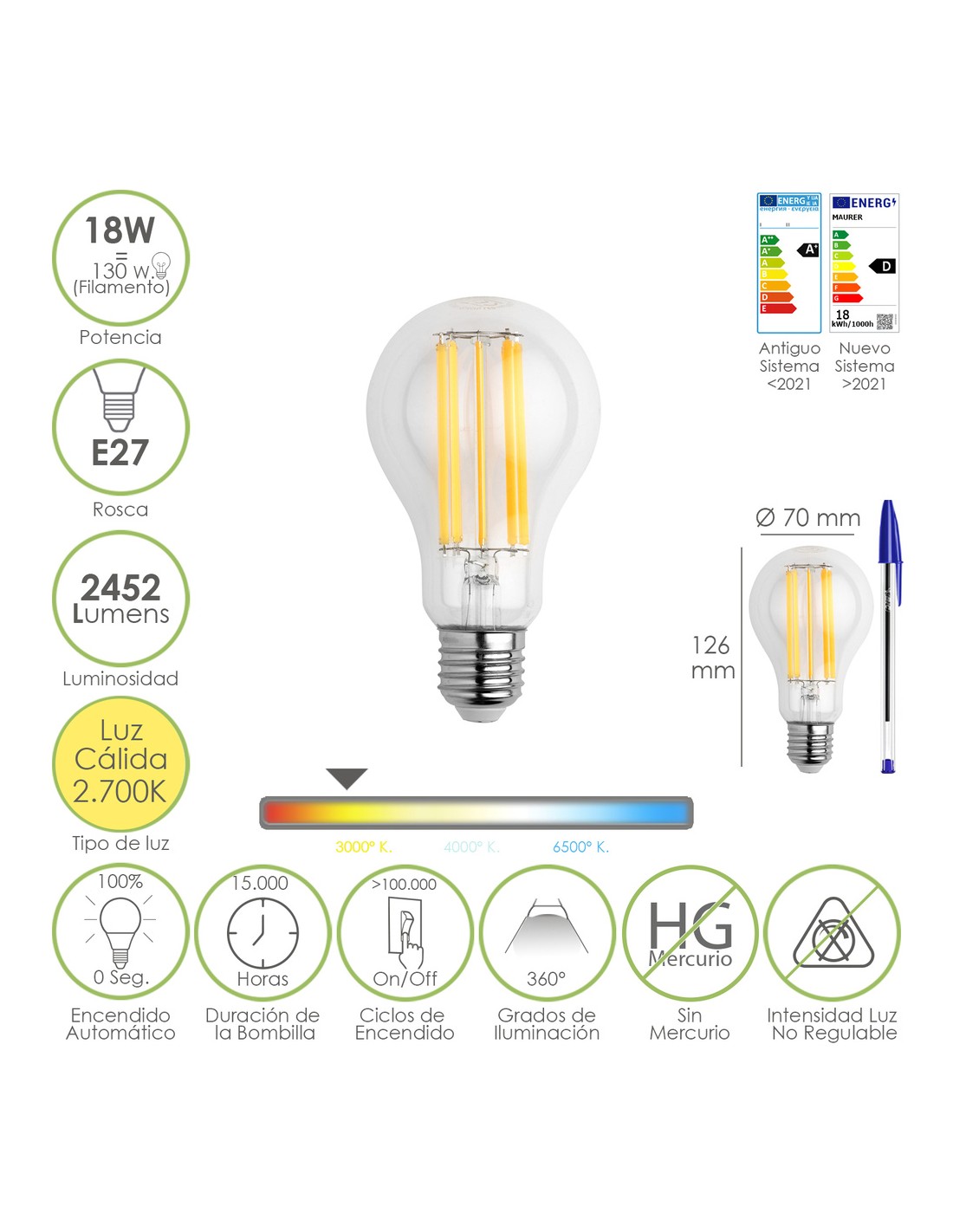 - Vida de la bombilla 15.000 horas.