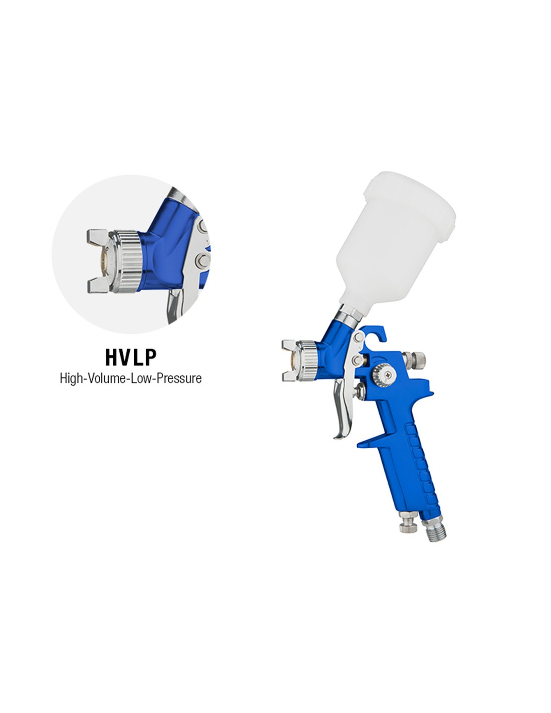 - Sistema HVLP (alto volumen, baja presión) de precisión que utiliza grandes volúmenes de aire para atomizar la pintura a baja presión