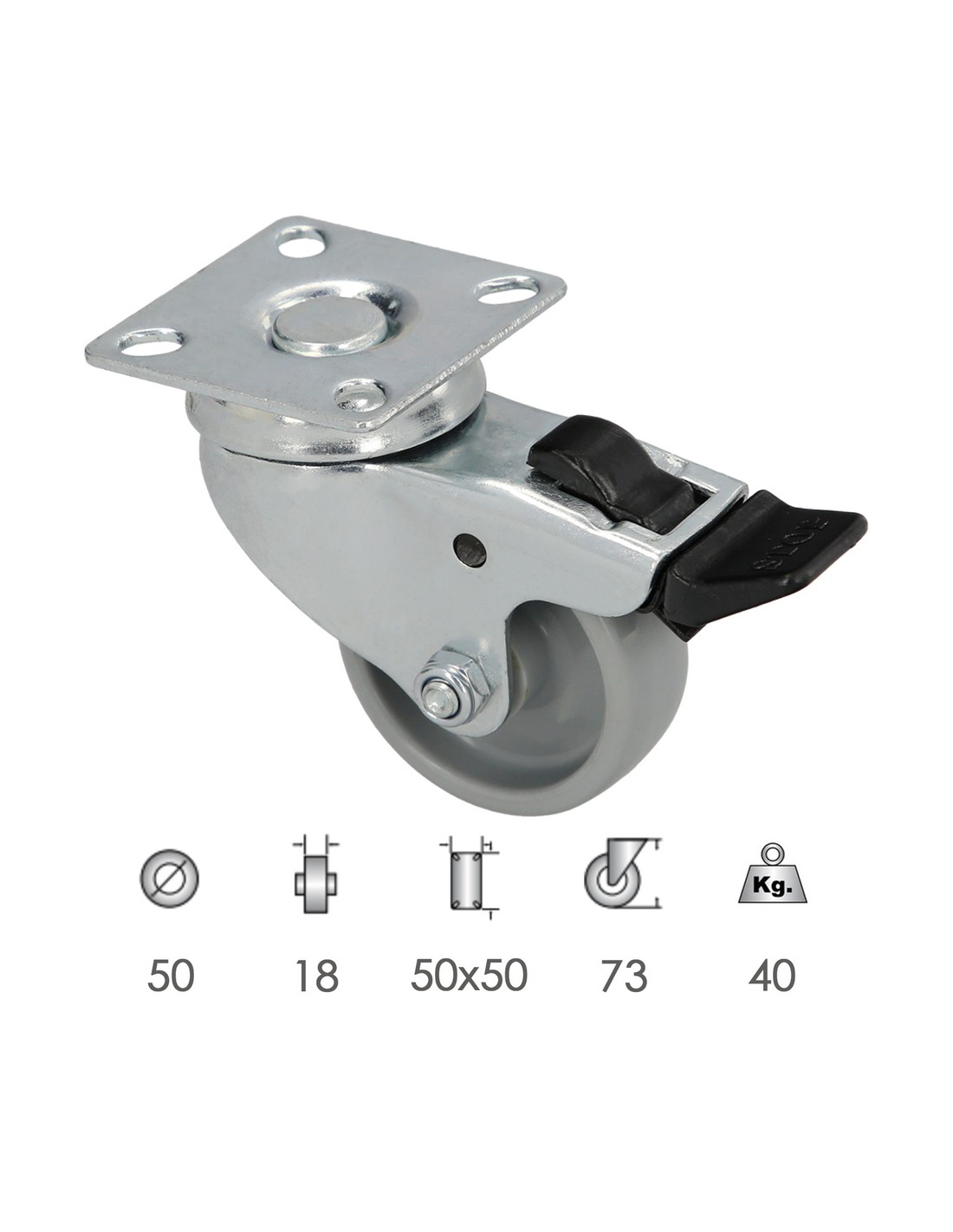 Rueda Domestica Ø 50 mm. Con Placa 50x50 mm. Con Freno