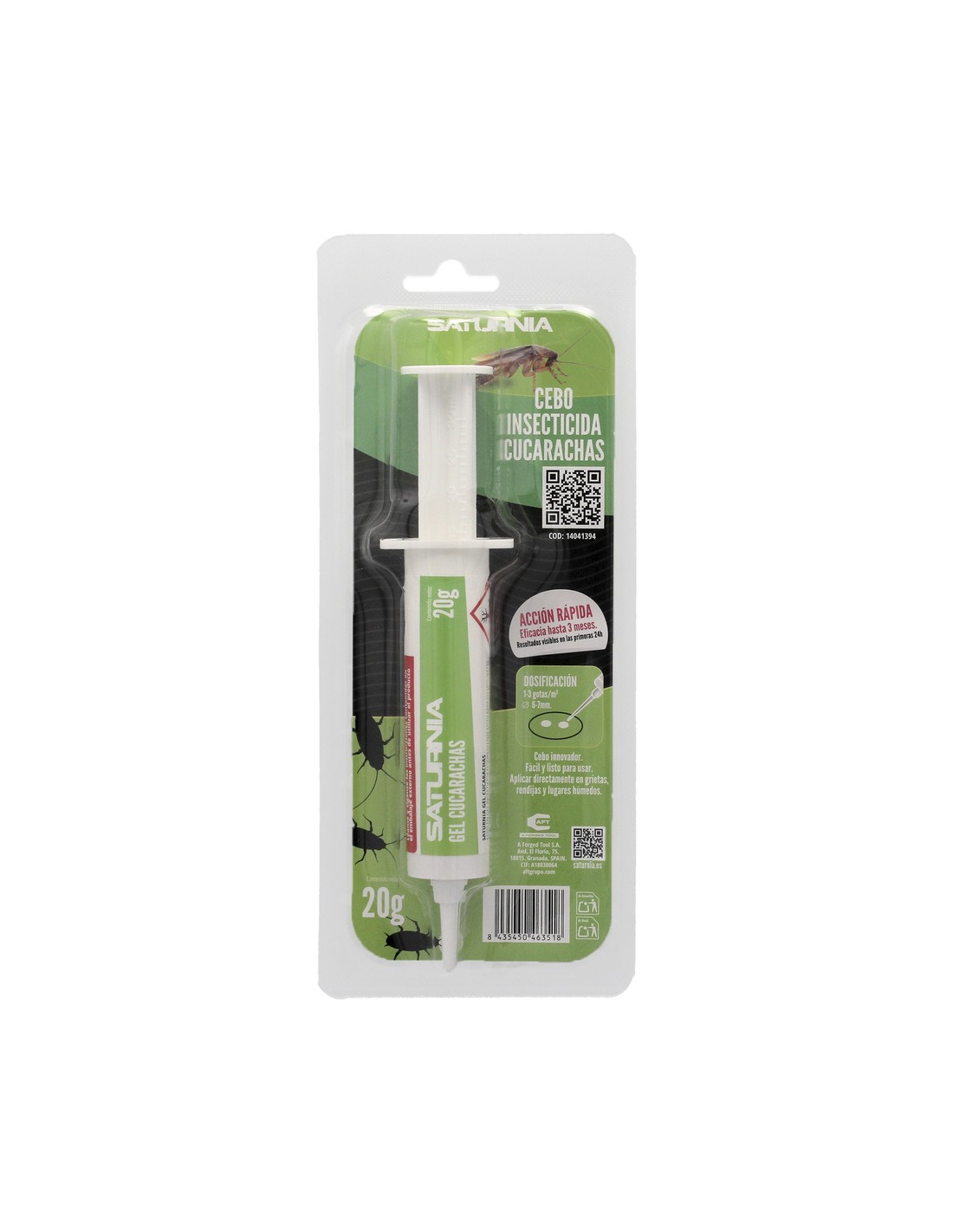 - Dosis y frecuencia de aplicación: Retire la tapa de la punta de saturnia gel de cucarachas y colóquela sobre la superficie a tratar, presione lentamente el pistón y aplique el producto en gotas siguiendo la dosis indicada debajo. Cierre la jeringa al final de la aplicación del producto.